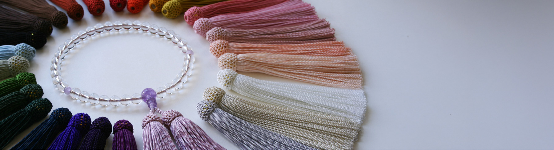 もっともシンプルな房色です。日焼けによる色の変化(黄ばみ)を防ぐため、ごく僅かに青みを帯びた色で染め上げられています。玉色を選ばず、どのようなお数珠もきりりと爽やかな印象にまとめます。