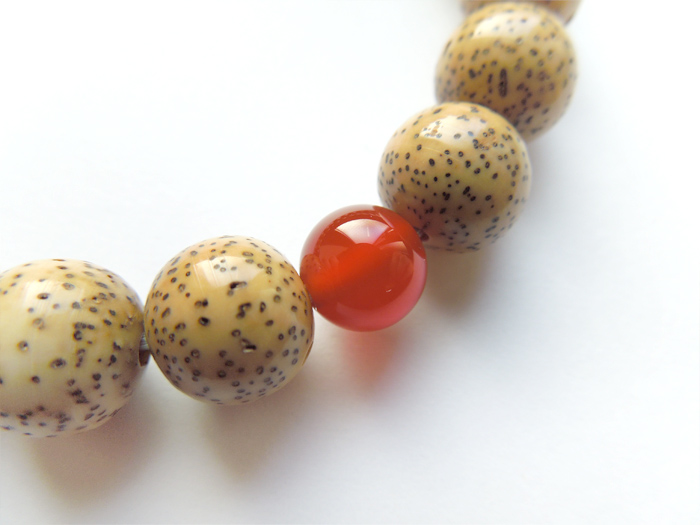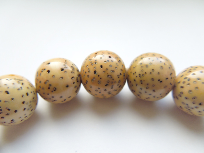割れにくいお念珠です。また使うほどに色艶を増し、味わい深い色合いになります。 - 一般に流通している星月菩提樹の中には、無選定の玉を漂白し見目を揃えている品が多く見られます。