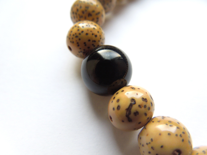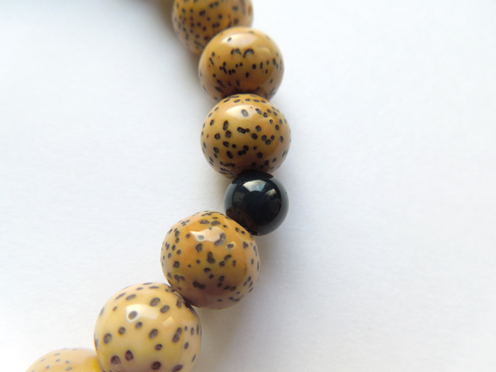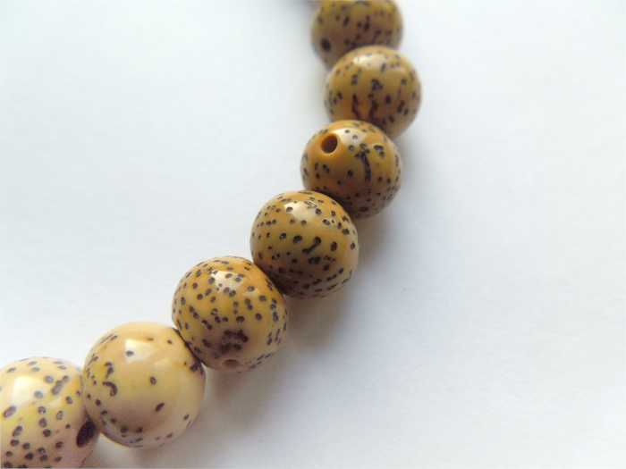 割れにくいお念珠です。また使うほどに色艶を増し、味わい深い色合いになります。 - 一般に流通している星月菩提樹の中には、無選定の玉を漂白し見目を揃えている品が多く見られます。